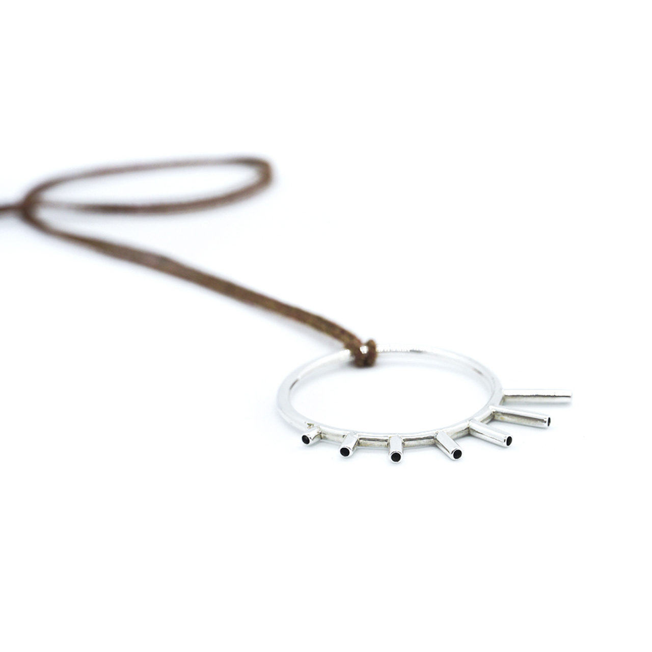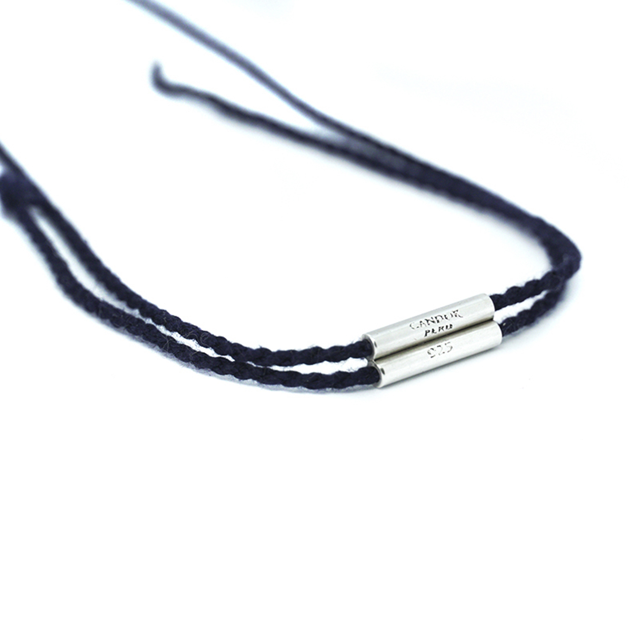 Dije de plata 925 con pita de algodón Pima y terminación de plata con doble tubo para regular largo.
