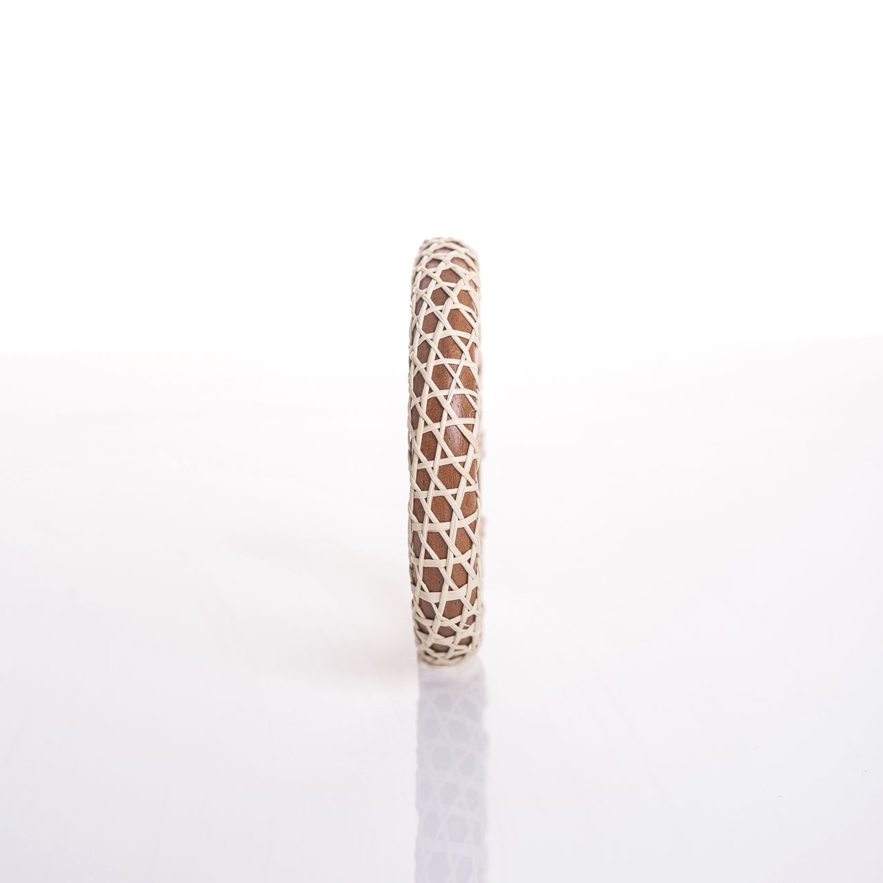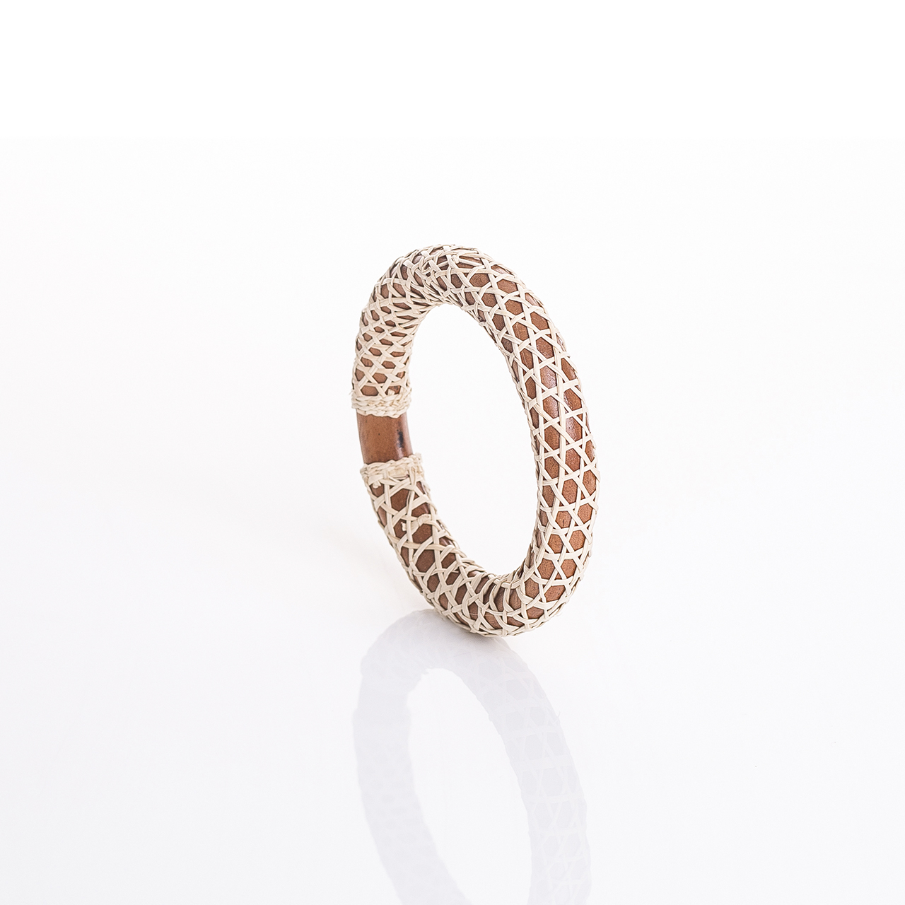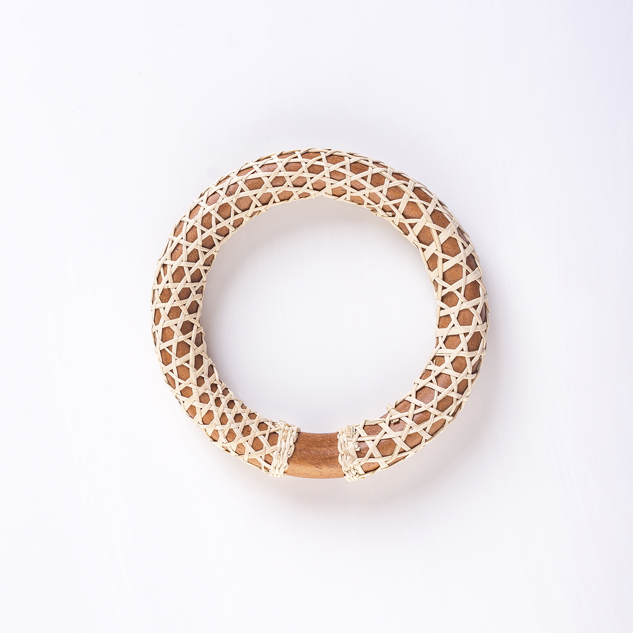 Pulsera de madera tejida con paja toquilla.